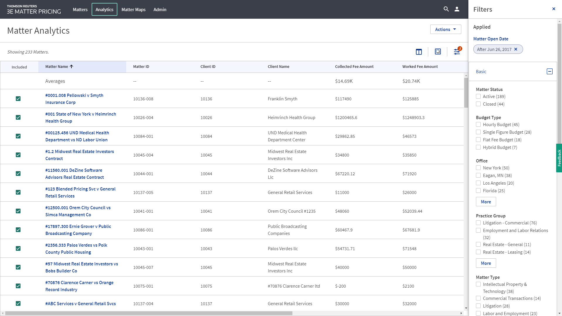 A new cloud-based product from Thomson Reuters Elite, 3E Matter Pricing, provides a suite of tools intended to help firms more accurately plan, track and analyze matter budgets. It integrates with 3E, Elite’s business management system for law firms, to extract key financial data — such as fee earners, rates and billing information — to allow lawyers and pricing professionals to price different scenarios.