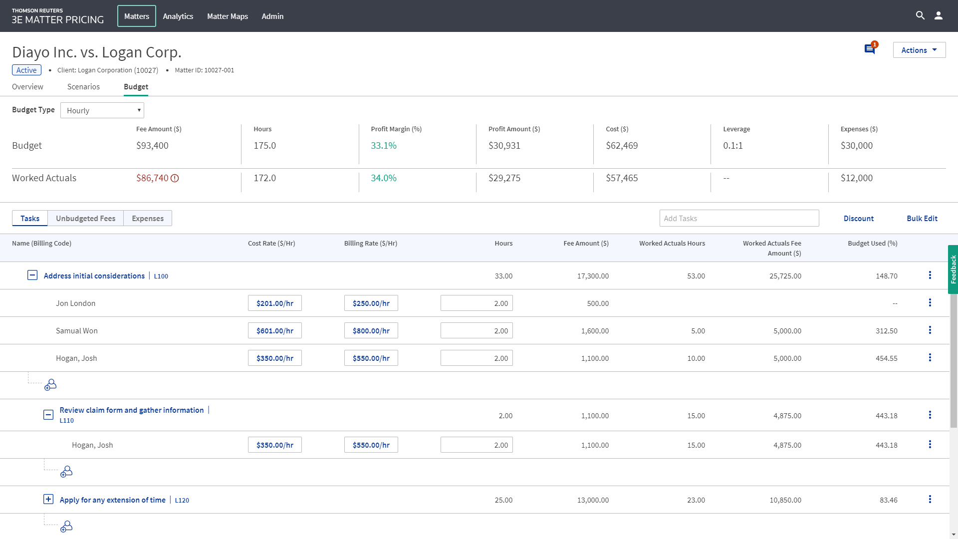 To that end, a key feature of 3E Matter Pricing is that it is designed to be lawyer-friendly. It provides various tools to help lawyers more easily set matter budgets, such as the ability to recall budgets from past matters and to try out different pricing scenarios. Pricing can be done for both hourly and fixed-fee matters, and can be broken down by phases, phases and tasks, and resources.