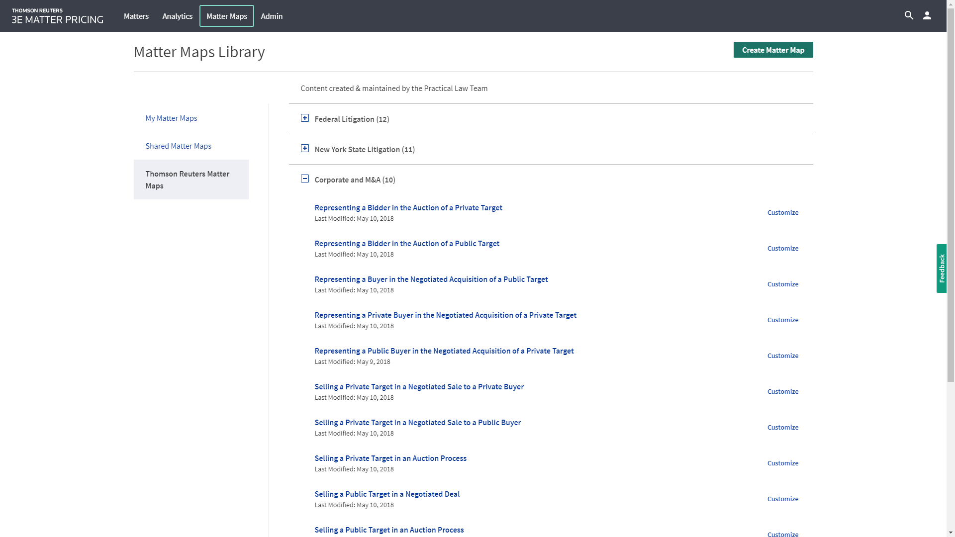 Unique to this product are more than 50 Matter Maps. These map out the key phases and legal tasks in common legal matters, and can be used as guides when beginning the budgeting process. The maps were created by legal editors from Thomson Reuters Practical Law and are kept up to date to reflect changes in the relevant law. (Each map displays the date it was last updated.)