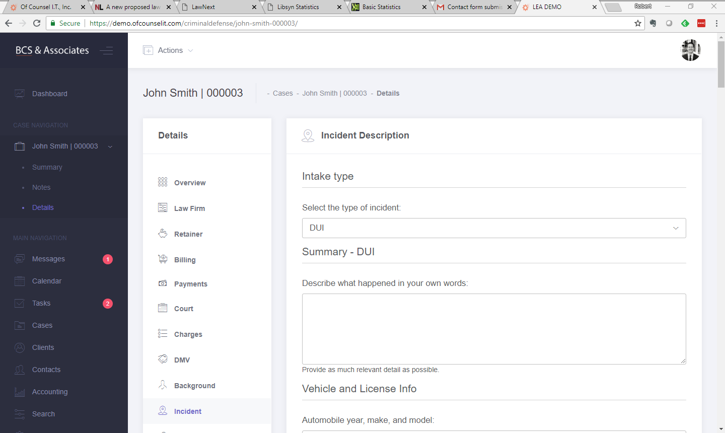 The only speed bump I hit was in figuring out how to switch the intake questionnaire from a general matter to a DUI. (It’s on the incident description tab, where you select the type of incident from a drop-down menu.)