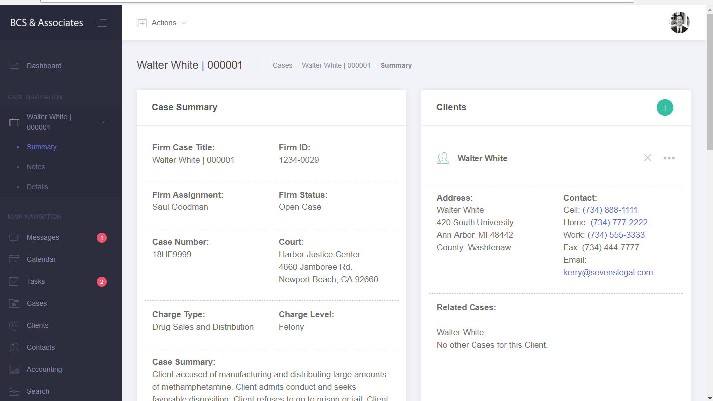 Hogle let me try out a demonstration version of the platform, prepopulated with dummy case and client information. I am not a criminal lawyer, but it seems to me that the intake questionnaires were thorough and would be helpful to a lawyer. Even without documentation, the platform is easy to use and fairly intuitive to learn.