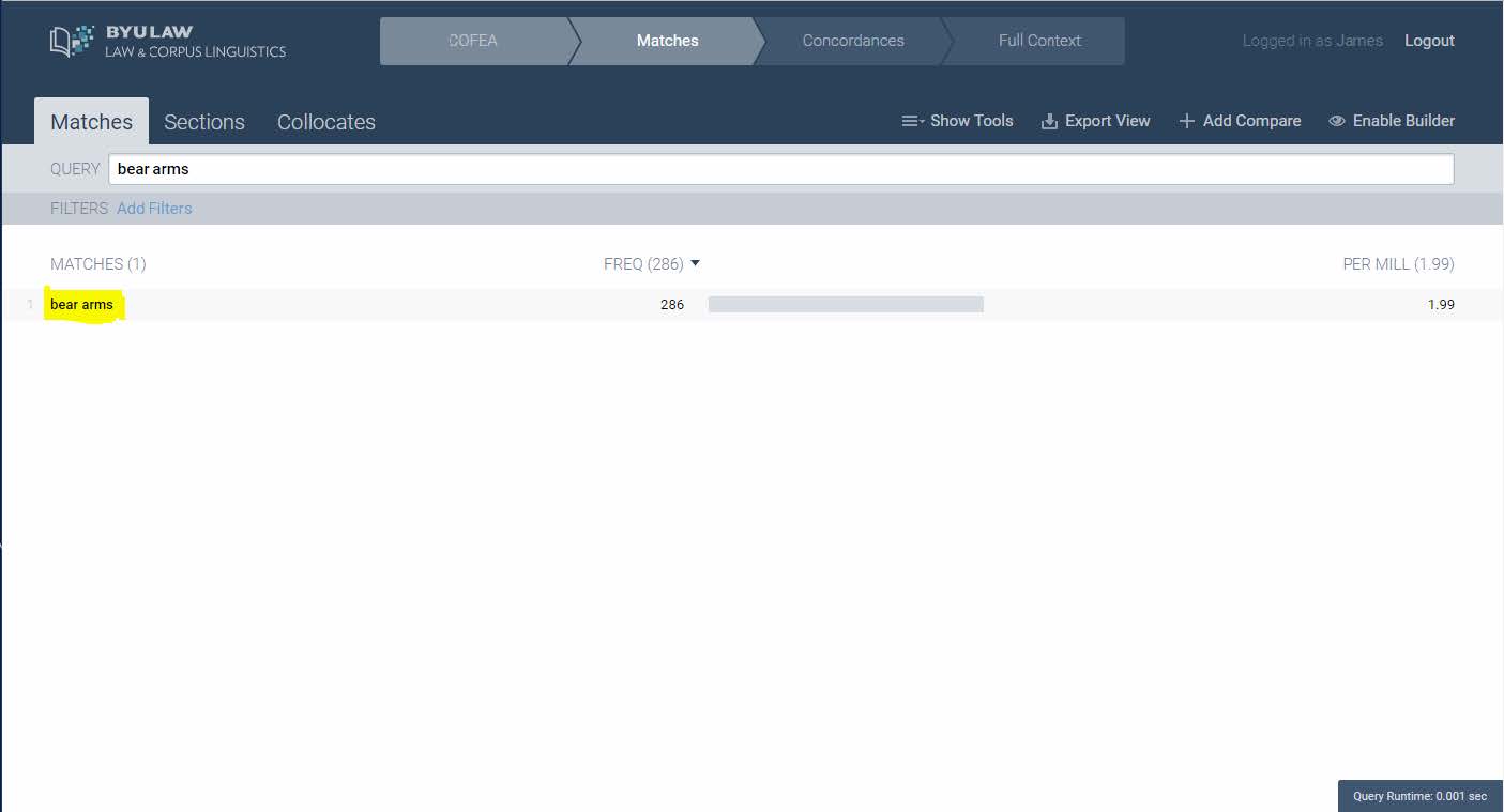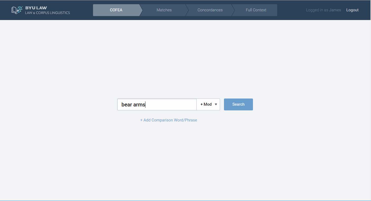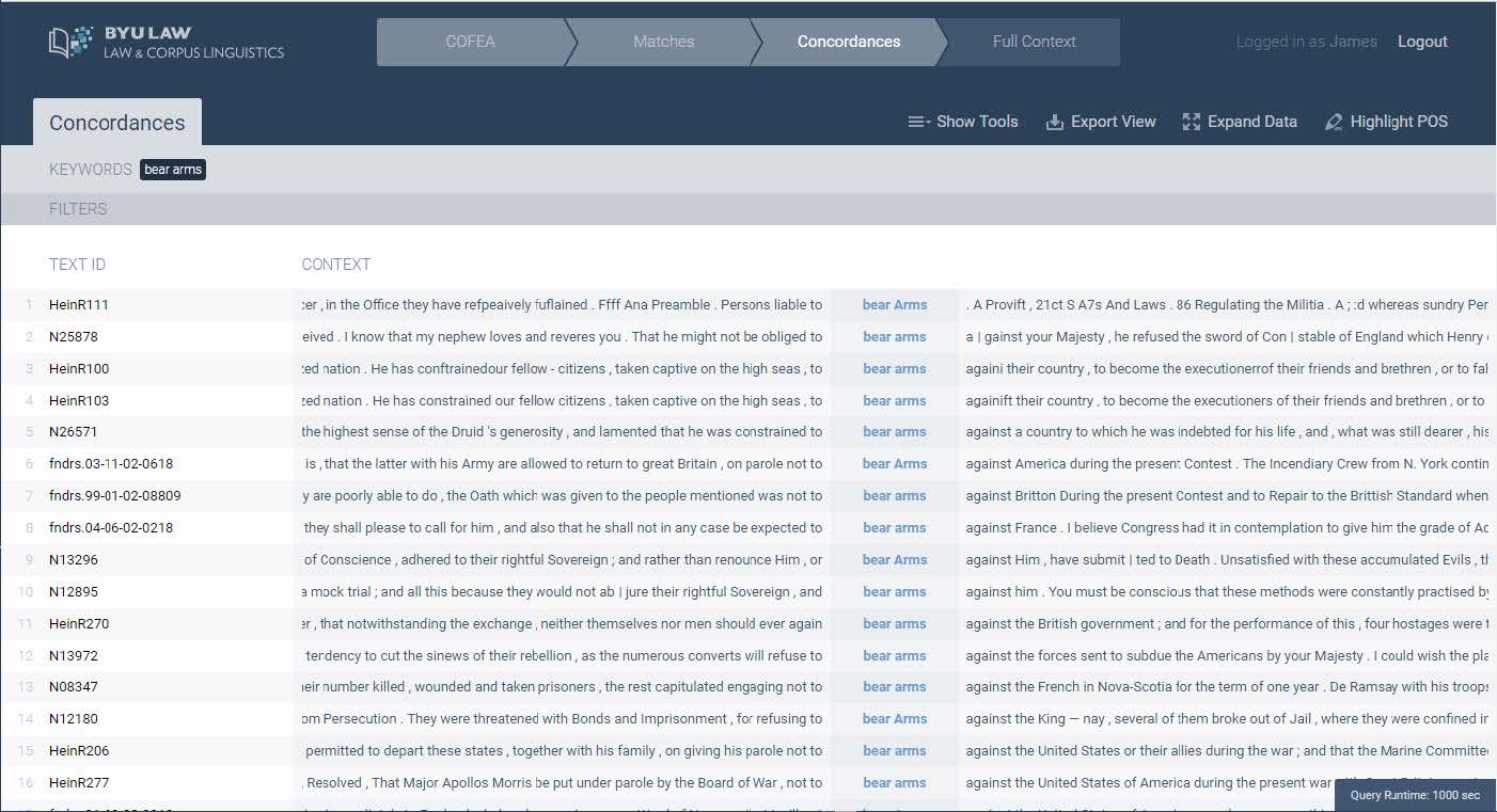 Last week, Dean Smith walked me through a demonstration of the new Law and Corpus Linguistics platform. Using the Corpus of Founding Era American English, or COFEA for short, he showed me how the platform could be used to explore the meaning of the phrase “bear arms.” (I later logged in on my own and replicated his search, and also performed some other searches of my own.)