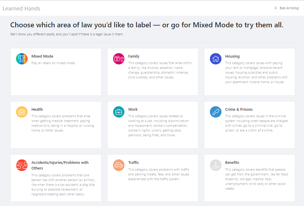 To play, you must first register, either by using a social media profile or creating a unique account. You need not be a lawyer or have any legal training to participate. After registering, you come to a screen that asks you to choose the area of law you’d like to label, or you can pick Mixed Mode to try them all.