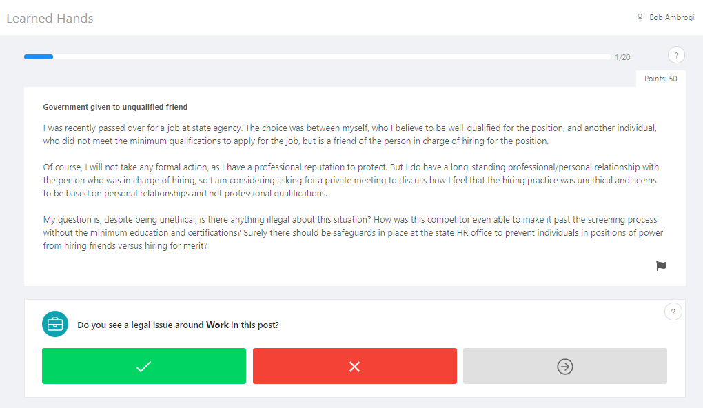 I started with work issues and was presented with a Reddit user’s question and then asked if I saw in it a legal issue around work. I did, so I clicked the green check box. Once I did, I was presented with another user’s question and again asked if I saw a work issue.