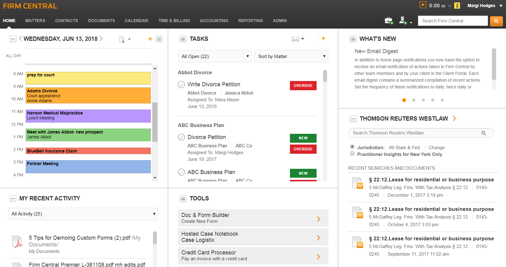 Firm Central is a leading cloud-based practice management solution for solo and small law firms, providing desktop compatibility with Outlook and Windows 10 and access to a user’s essential practice functions in one convenient dashboard. Firm Central combines firm management tools, such as scheduling and time & billing, with practice resources, such as legal research, rules-based calendaring and automated document drafting, to provide the most comprehensive legal practice management software in the small law firm market. It also allows firms to easily store, organize and share information in one integrated, secure platform. Firm Central’s fully integrated legal time & billing feature enables users to enter and track time within the Firm Central dashboard. Built-in accounting features provide seamless accounting and bookkeeping tailored to fit your law firm needs.