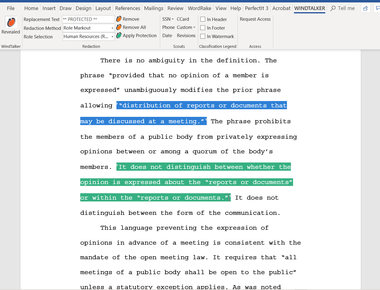 In order for someone else to be able to view the portions of the document to which they have access, they will have to be running the WindTalker client software. Someone who does not have access or who does not have the software will see PROTECTED in place of the protected text. WindTalker is enabling free guest licenses for third parties to view documents protected with its software.