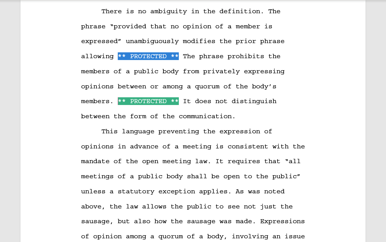 That means that you can protect any text or image within a document — paragraphs, lines or even just words — and set access for different roles and people to any of those individual protected pieces, without have to generate multiple documents for different types of users. Within the same document, you could, for example, give your co-counsel access to some parts and your outside expert access to other parts. The same document can be opened by different people, and each person will see only what they have access to.
