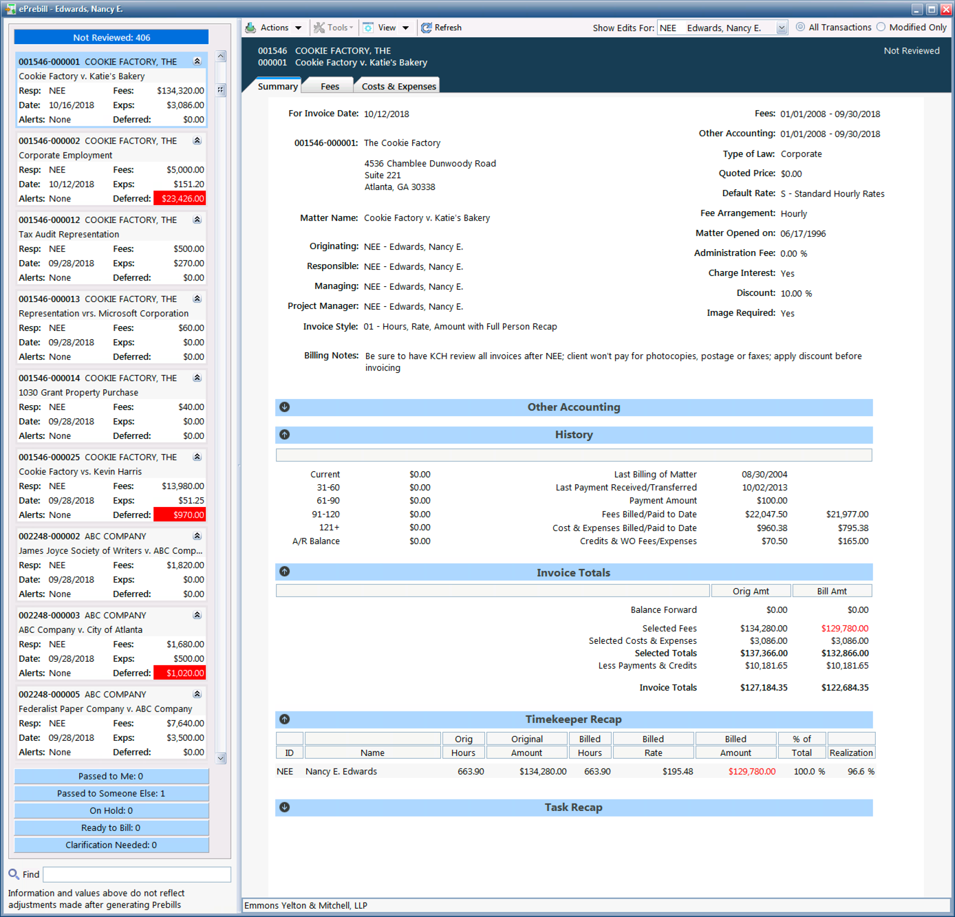 A major feature of Orion 5 is the new Orion ePrebill Manager, which was officially launched at Legaltech New York a month ago. ePrebill Manager provides a complete electronic workflow system for managing the prebilling process. The purpose is to allow firms to eliminate paper from their prebill process by providing tools to digitally route, review, edit, markup, accept and finalize invoices, as well as to track write-downs and realization figures. The system provides a full audit trail showing who made what changes, when and why.