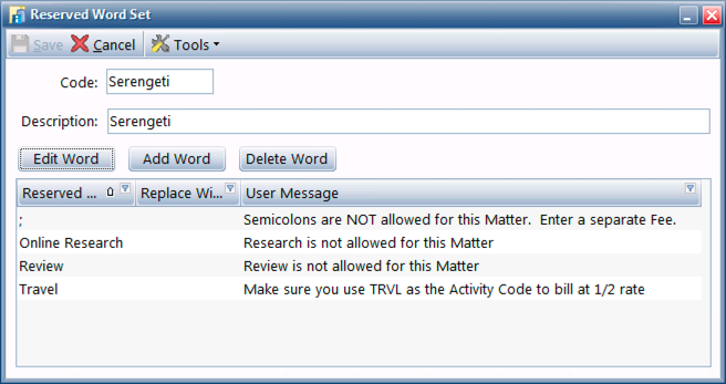 Users can create a single set of reserved words or different sets for different clients. This tool can also be used in the Prebill Manager to review all prebills or in the Bill Preparation stage, and can be applied globally or only against a specific client.